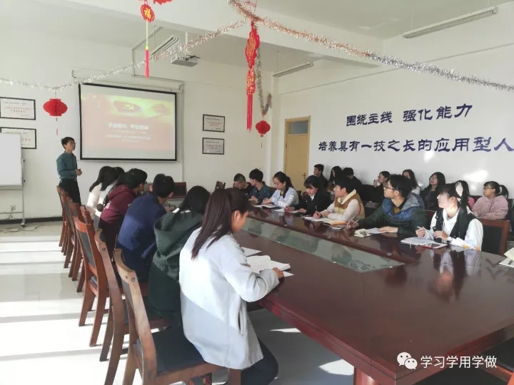 党总支书记于志奇从党的十九大主题、主要成果,习近平新时代中国特色社会主义思想,五年的历史性成就和历史性变革,中国特色社会主义进入新时代,我国社会主要矛盾的变化,坚定不移推进全面从严治党六个方面给全体党员上了一堂党课,进行了十九大精神解读辅导,鼓励学生党员坚定理想信念,志存高远,脚踏实地,勇做时代的弄潮儿,为实现中华民族伟大复兴的中国梦贡献青春的力量。